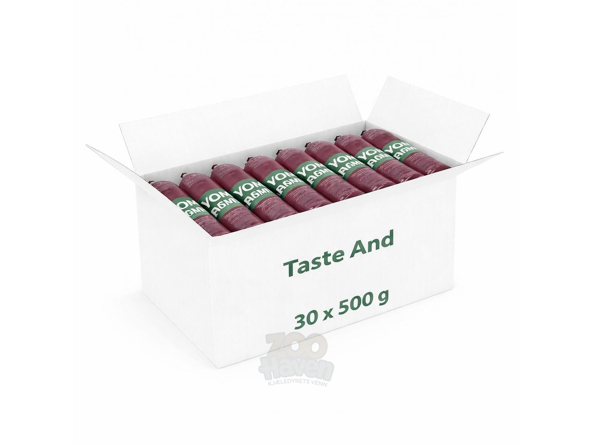 TASTE 100% And pølser er et eksklusivt produkt laget av kjøtt, bein og skinn. And er rikt på fett og protein og produktet passer ypperlig både som snack, tilleggsfôr eller under utredning for fôrrelatert allergi.