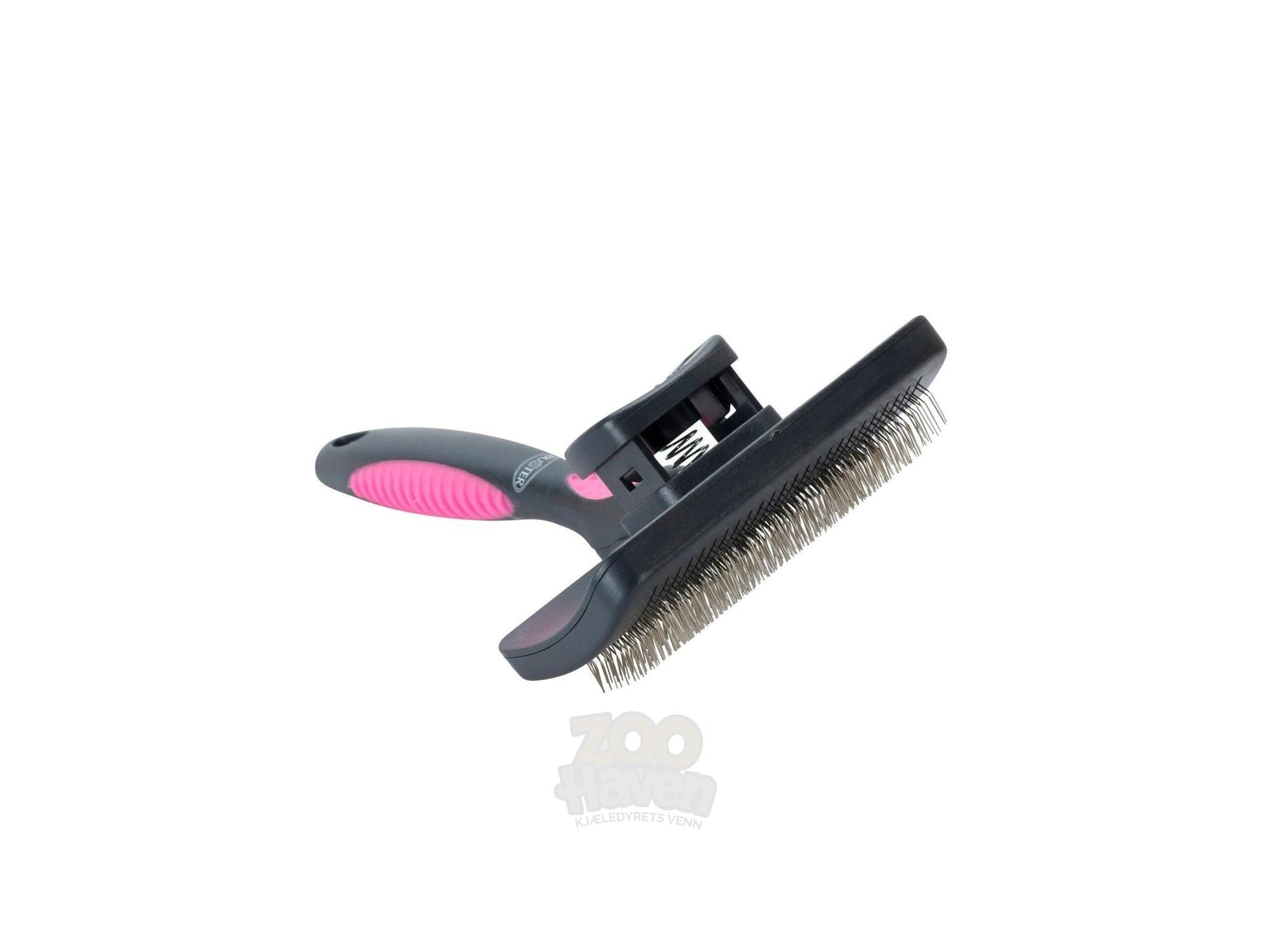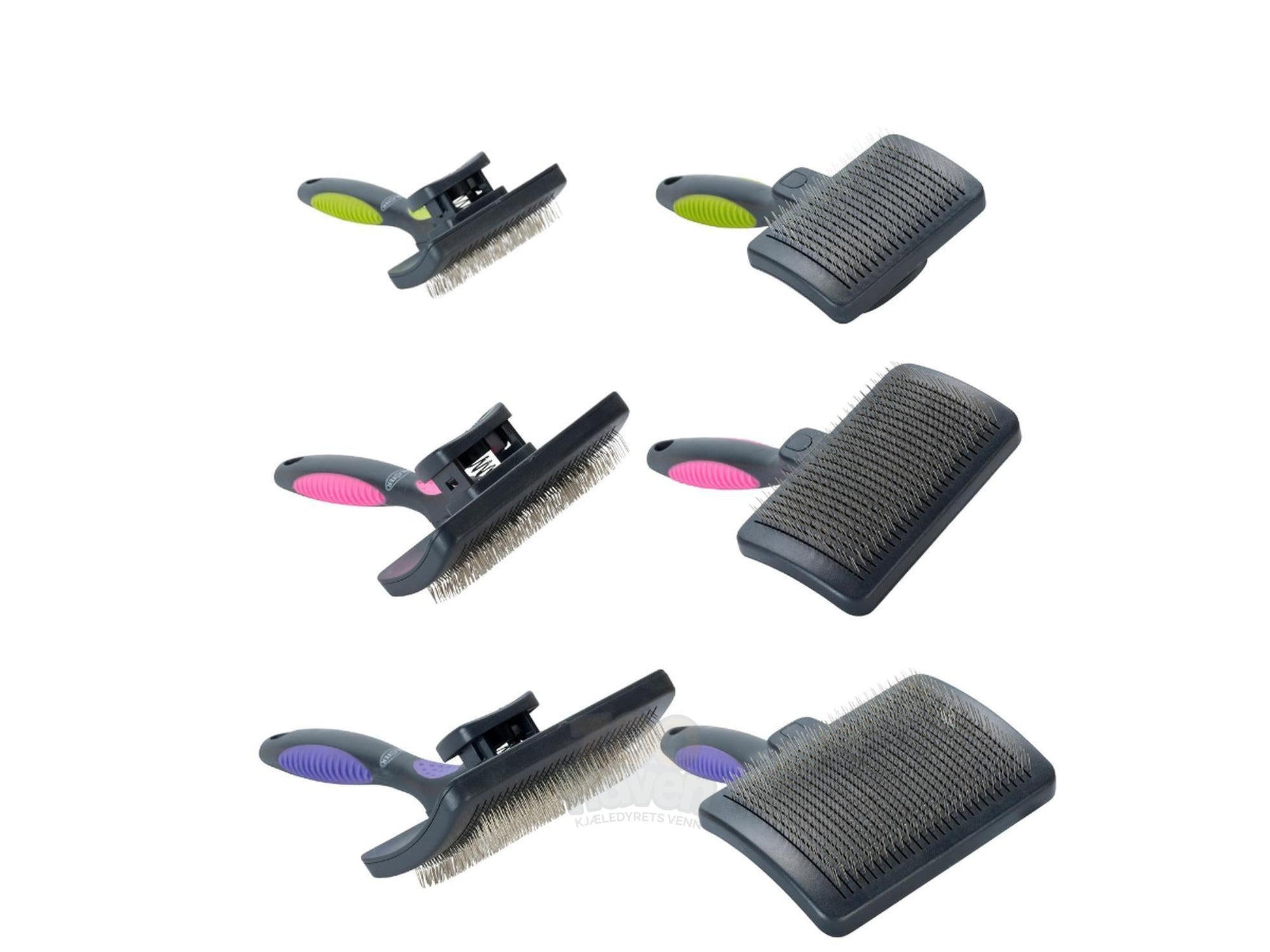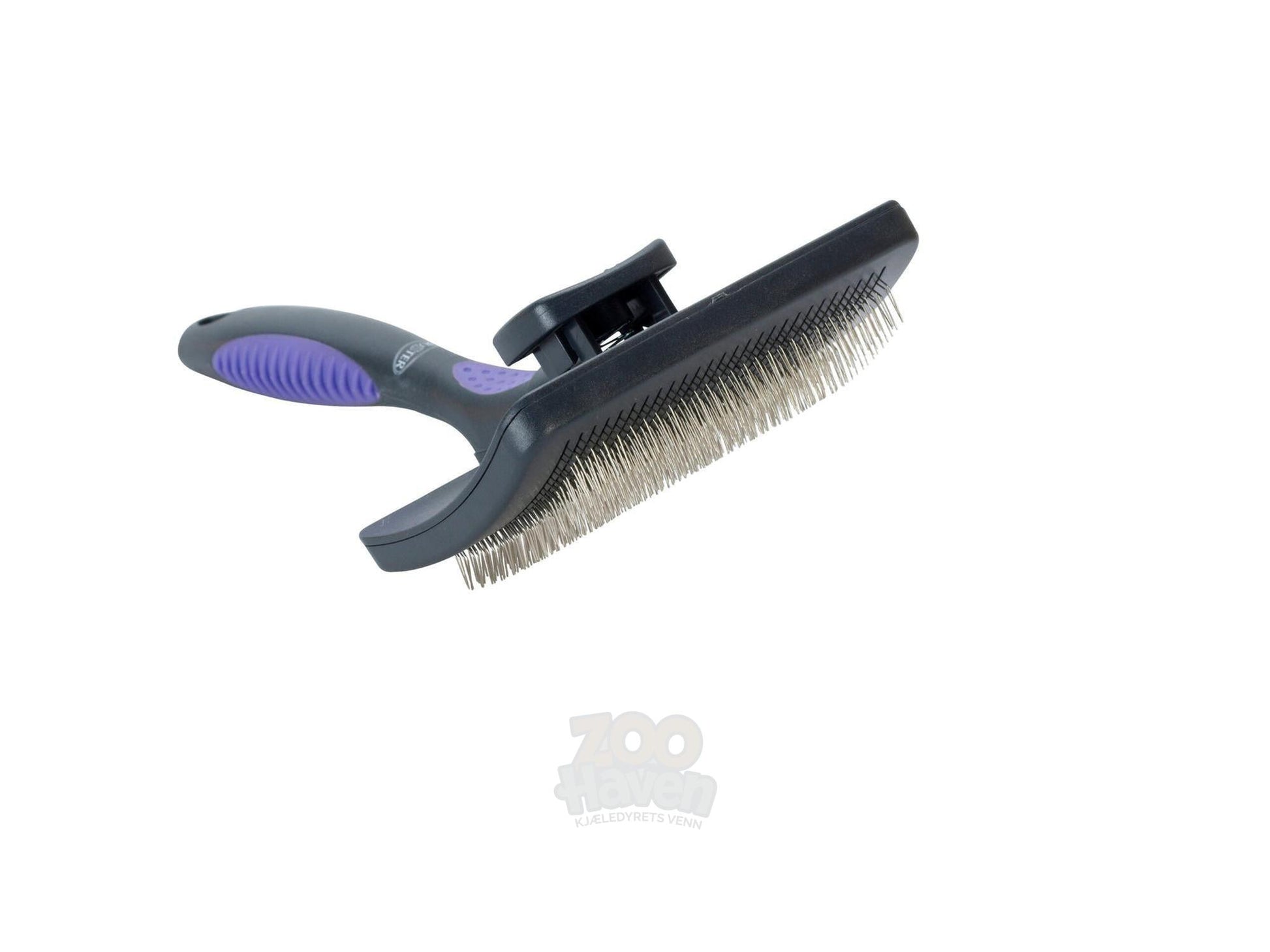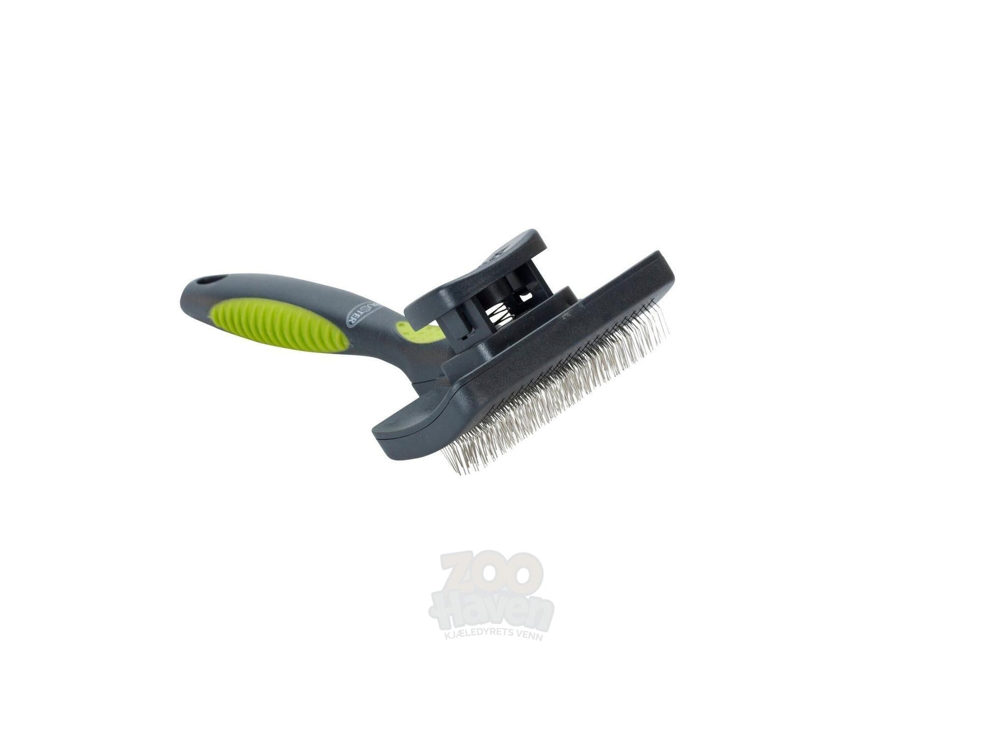 Effektiv karde med harde tenner som fjerner underull og floker. Selvrensende knapp for enkel rengjøring. For lang, tykk eller dobbelt pels.