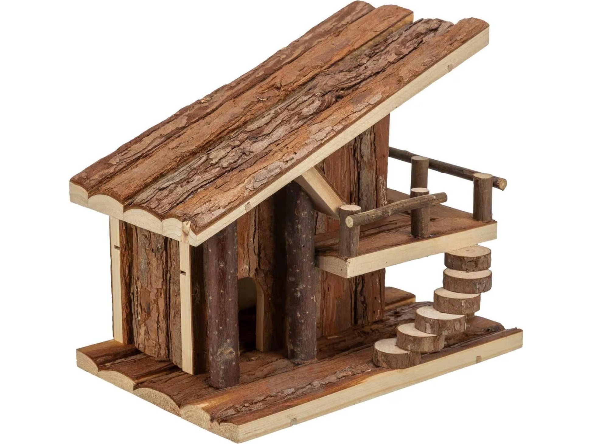 Et romslig hamsterhus i naturlig furu som gir smågnageren et trygt skjulested og et mer variert bomiljø. Huset er utformet med platå og rampe som oppmuntrer til bevegelse, klatring og utforsking i buret.