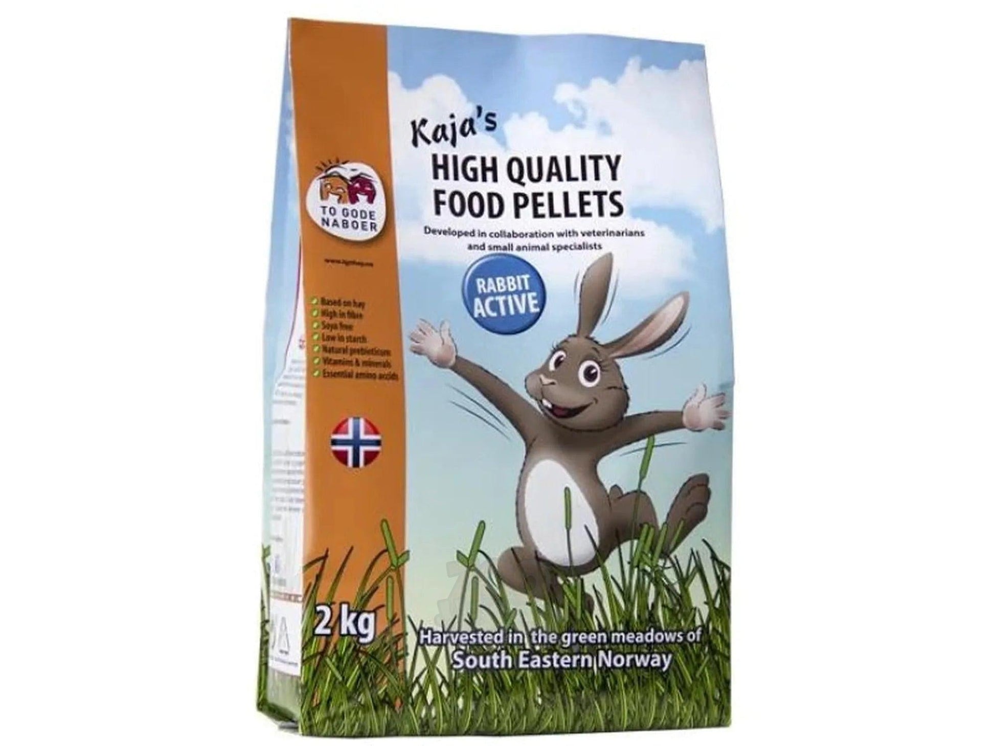 To Gode Naboer «Kaja’s Kanin Aktiv» 2 kg er et næringsrikt pelletsfôr laget for aktive kaniner med behov for mer energi. Fôret kombinerer grovmalt høy og urter med et balansert nivå av proteiner og fiber, noe som gir støtte til både energi, fordøyelse og generell helse.