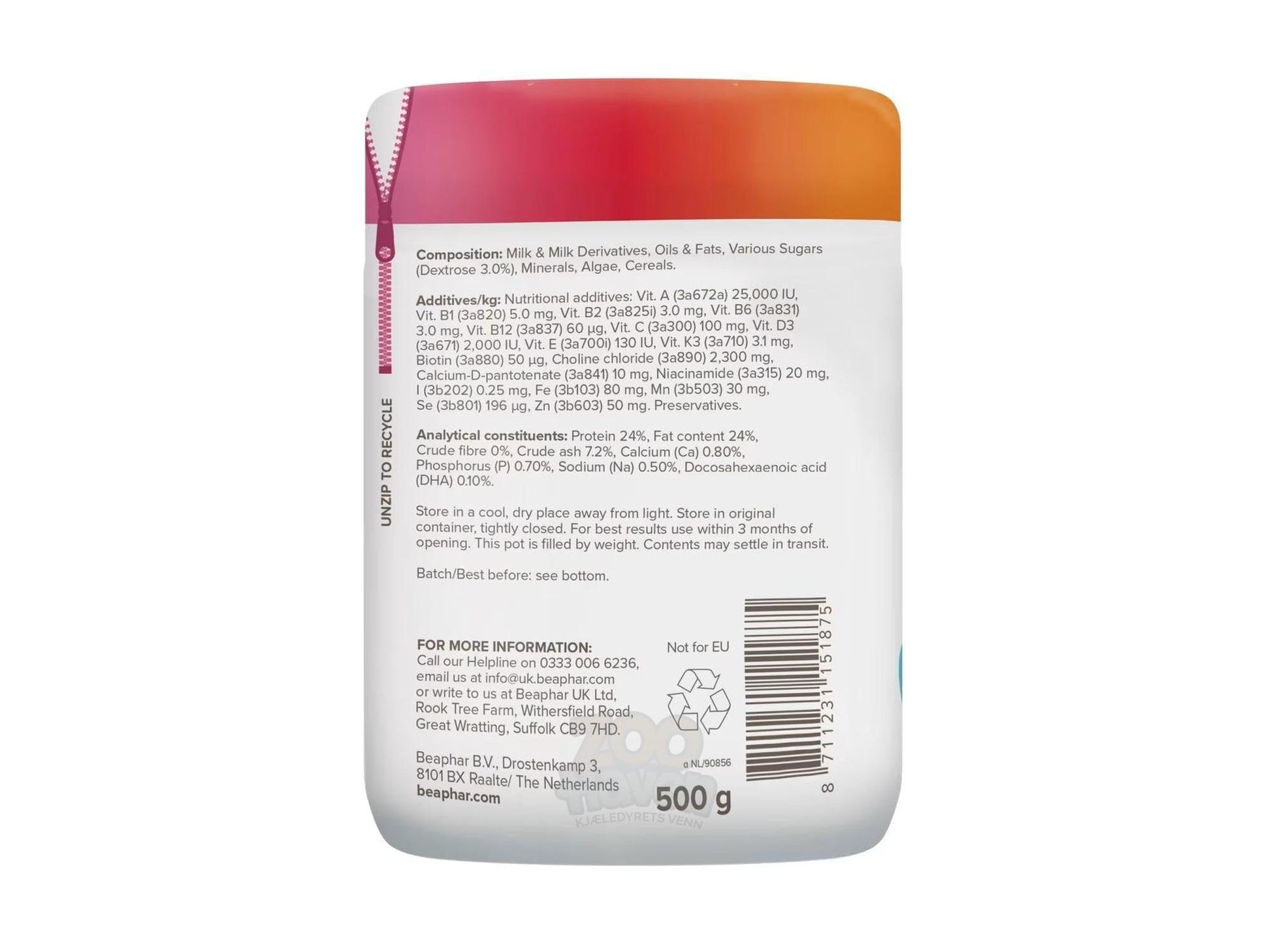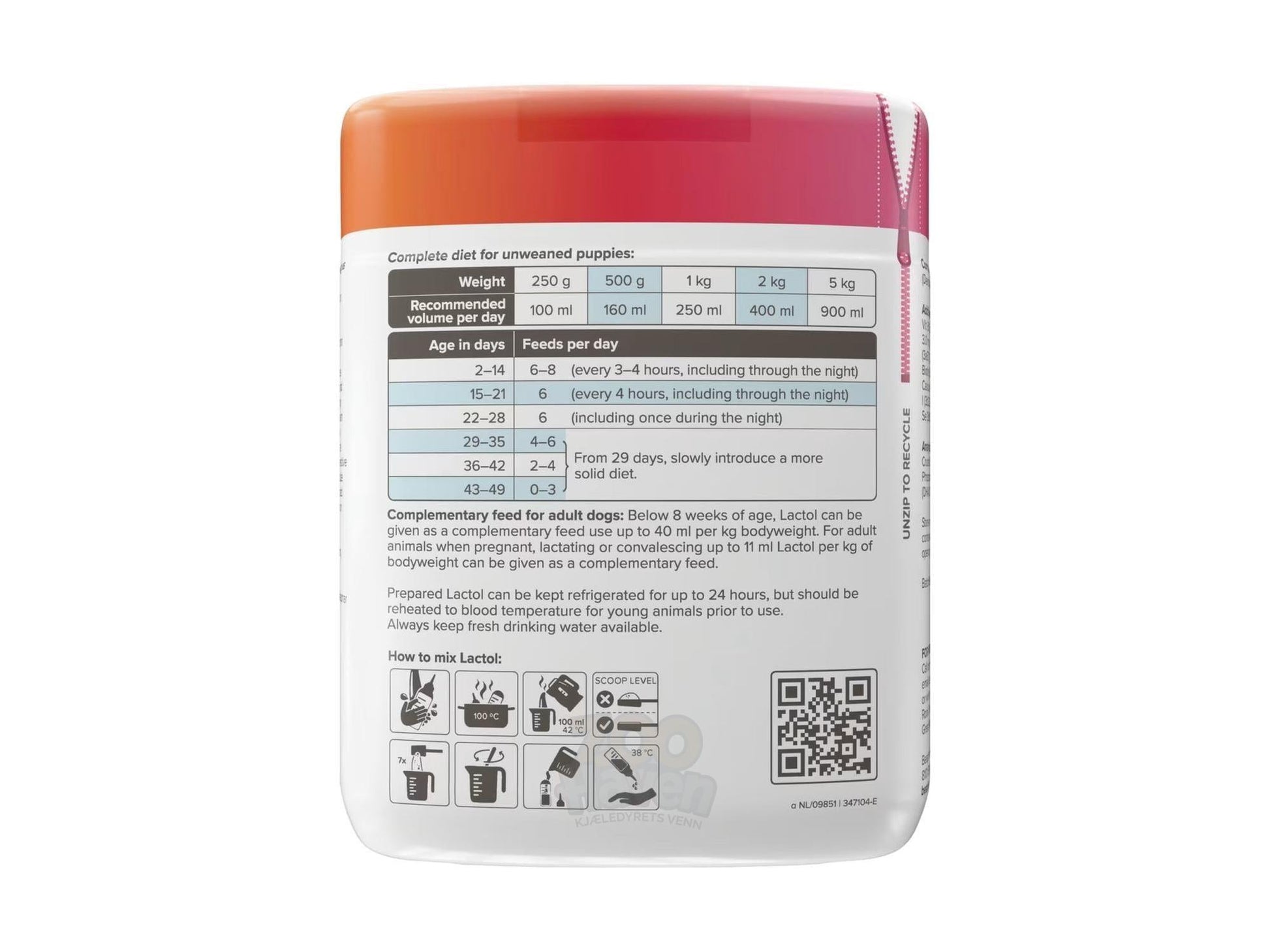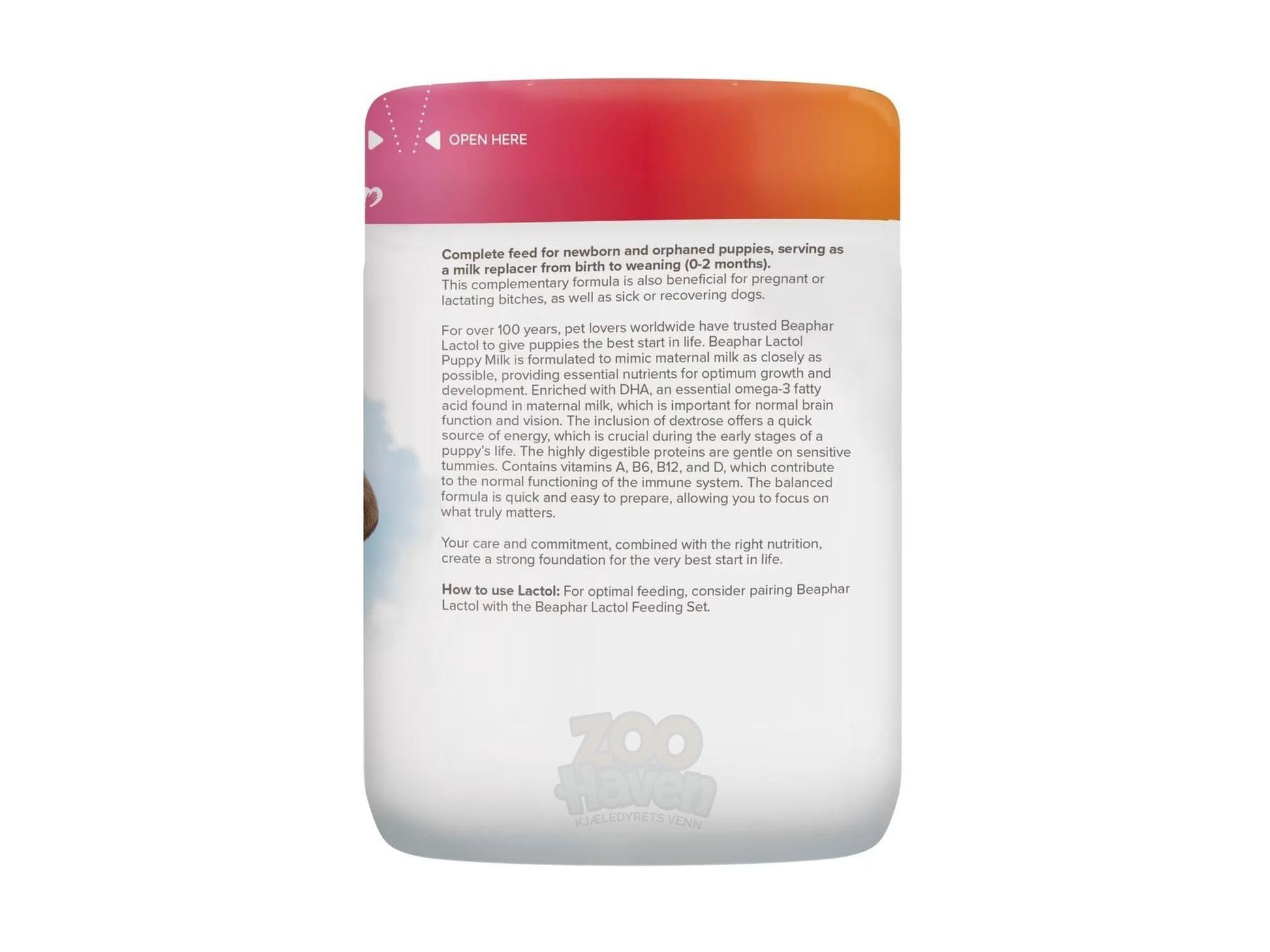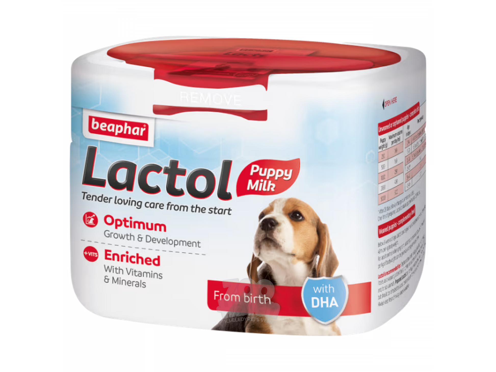 Beaphar Lactol Hundemelk er en komplett melkeerstatning som etterligner tispemelk så nært som mulig, utviklet for hunder ved fødsel og helt frem til avvenning. Den egner seg spesielt godt for orphaned valper, store kull, valper som trenger ekstra næring, eller som støtte til drektige eller diegivende tisper.
