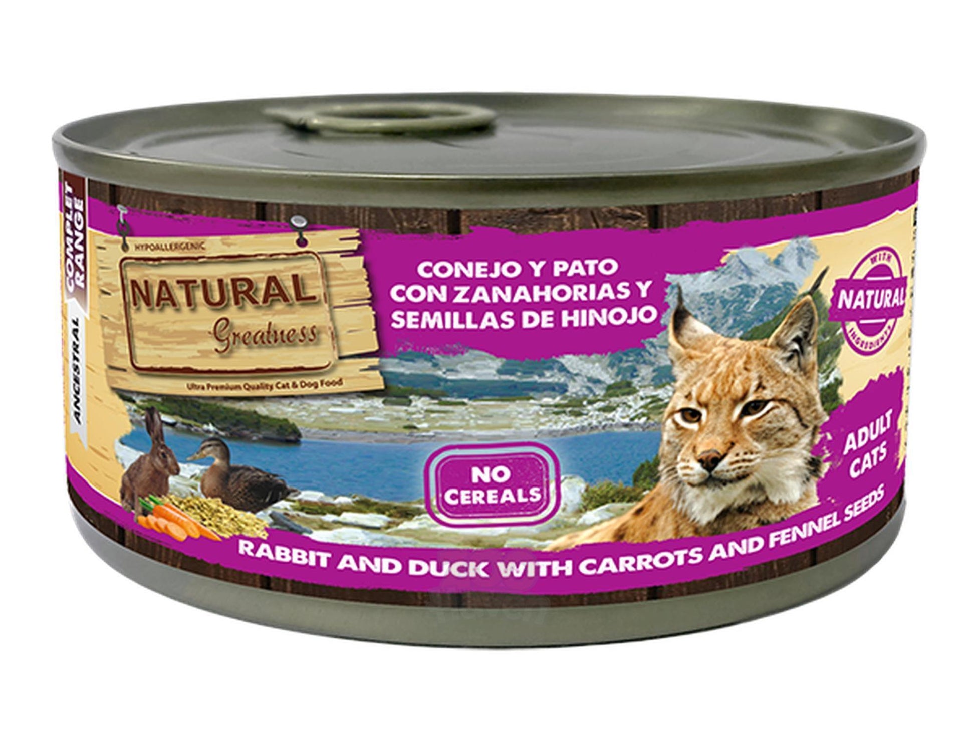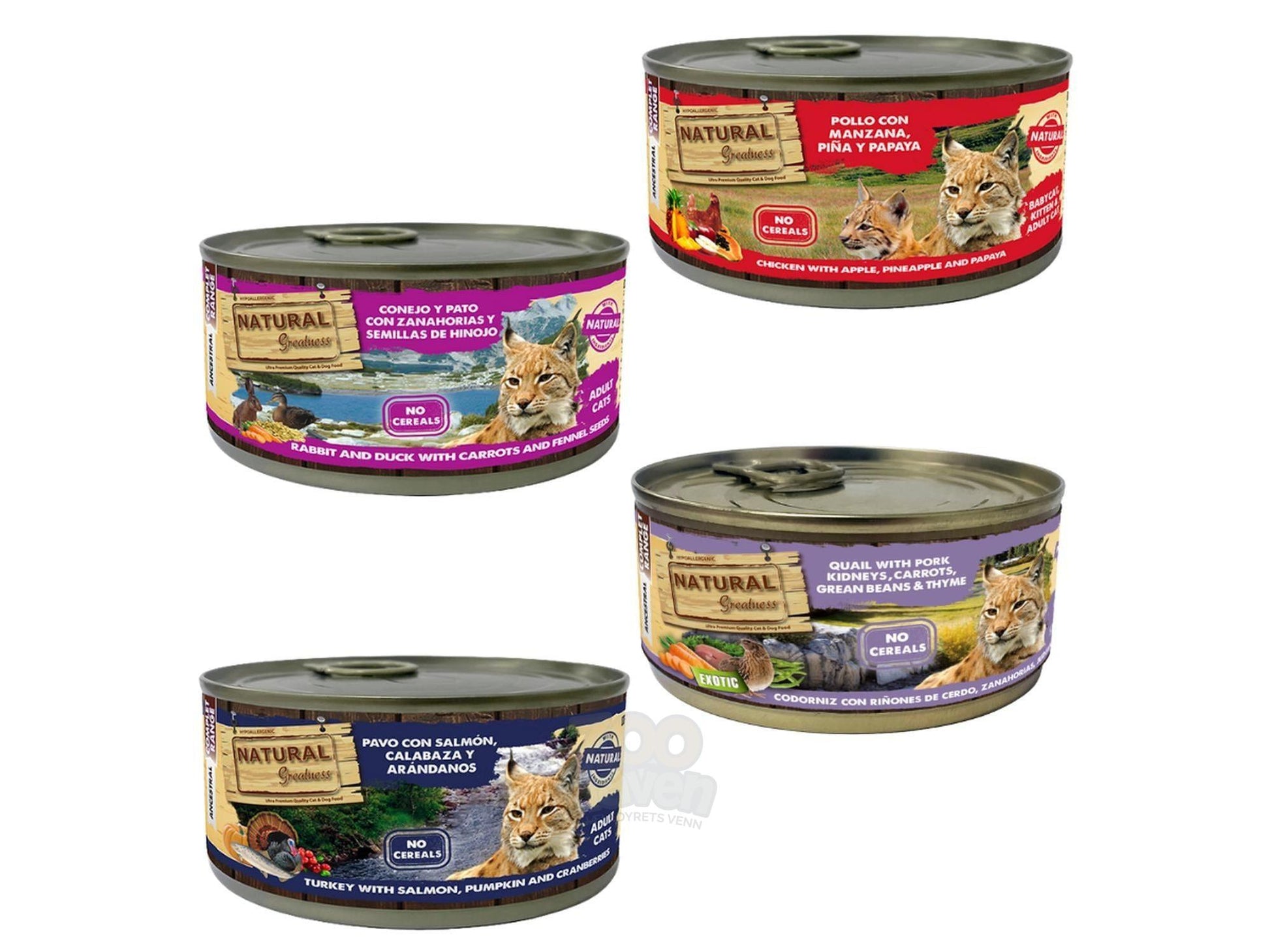 Natural Greatness Wet Food 170–185 g er et smakfullt og balansert våtfôr utviklet for katter i alle livsstadier. Alle variantene er kornfrie, hypoallergene og tilberedt med nøye utvalgte proteinkilder kombinert med sunne grønnsaker, frukt og urter. Oppskriftene er enkle og rene, helt uten kunstige tilsetninger, noe som gjør dem skånsomme for magen samtidig som de gir høy smakelighet.