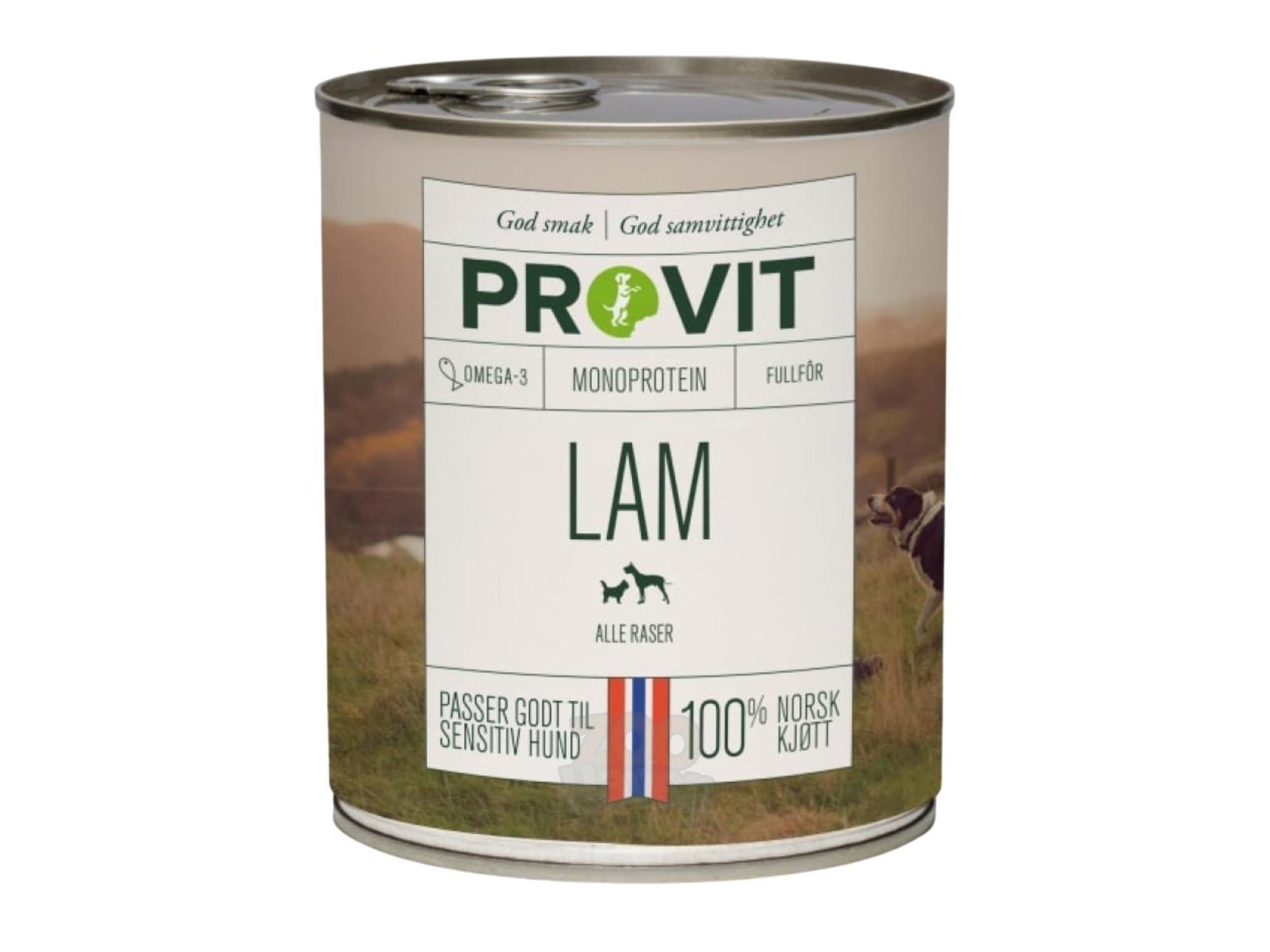 Provit Lam er et komplett og balansert våtfôr laget av norsk kjøtt fra lam. Oppskriften er kornfri og beriket med linfrøolje, en naturlig kilde til omega-3 som bidrar til sunn hud og blank pels, samtidig som den støtter hjerte, kar og leverfunksjon.