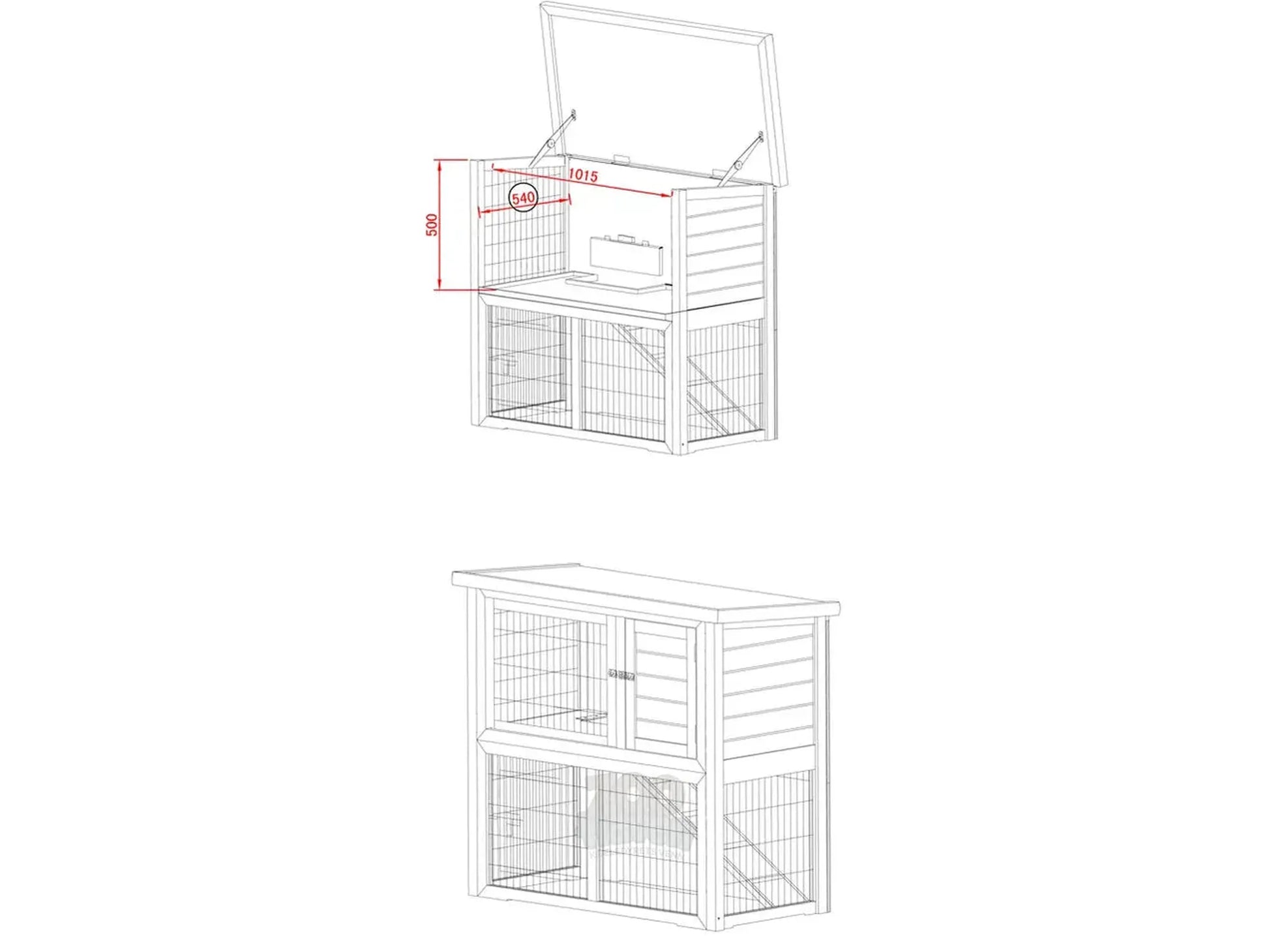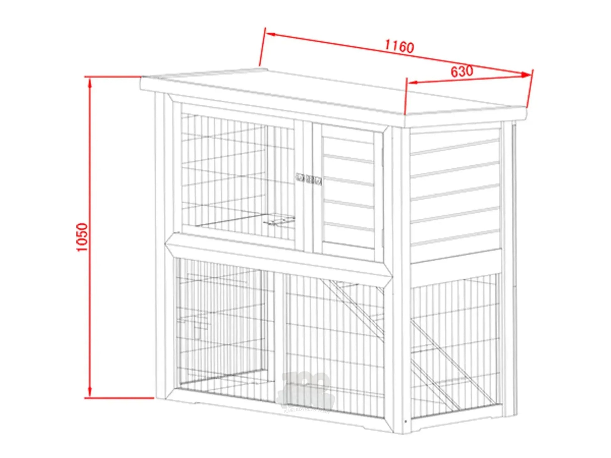 Den øvre delen fungerer som et beskyttet soveområde, mens den nedre gitterdelen gir god lufting og oversikt. Kombinasjonen av åpne og lukkede soner gir en trygg hverdag hvor kaninen både kan trekke seg tilbake og samtidig følge med på omgivelsene. Topplokket kan åpnes for enkel rengjøring og håndtering.