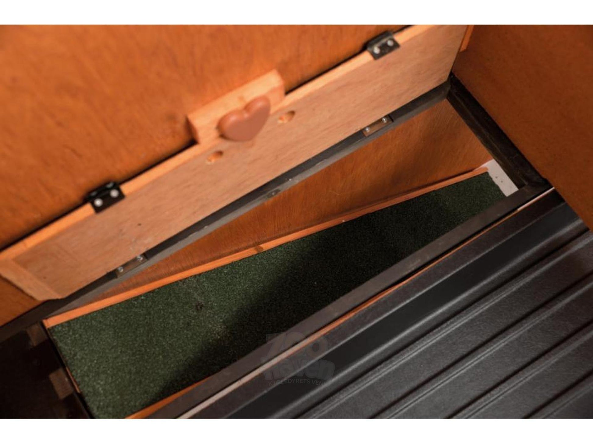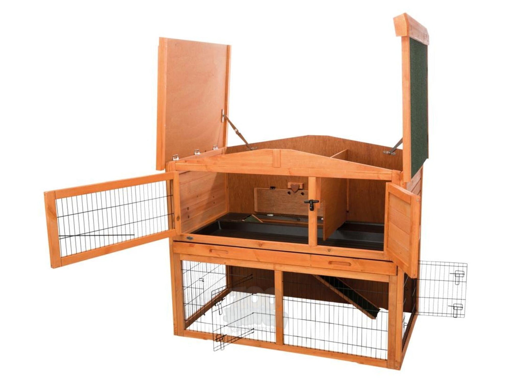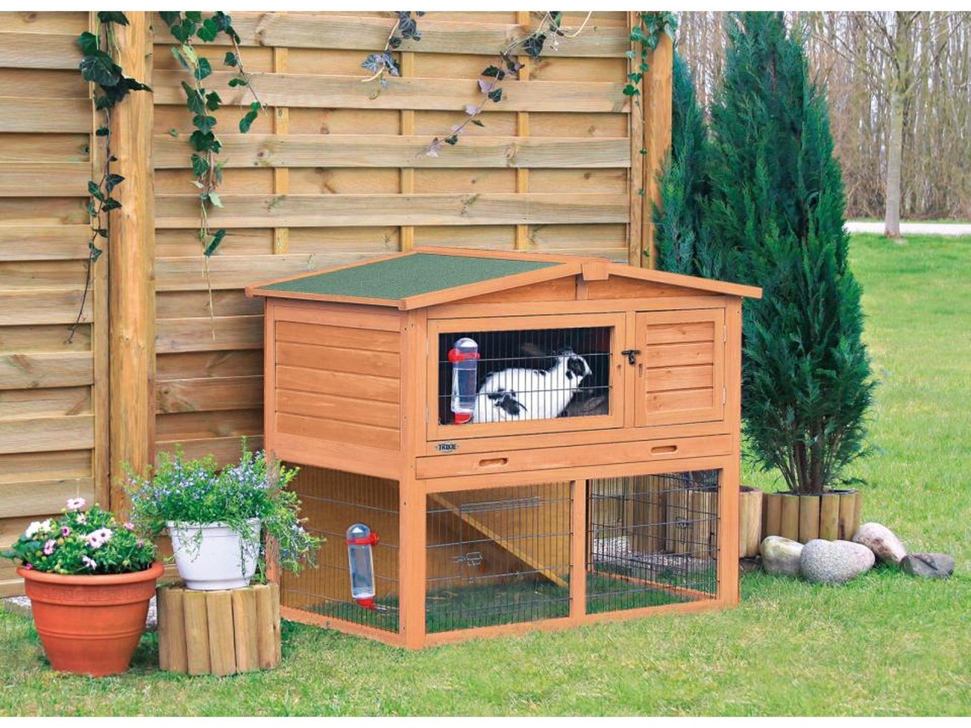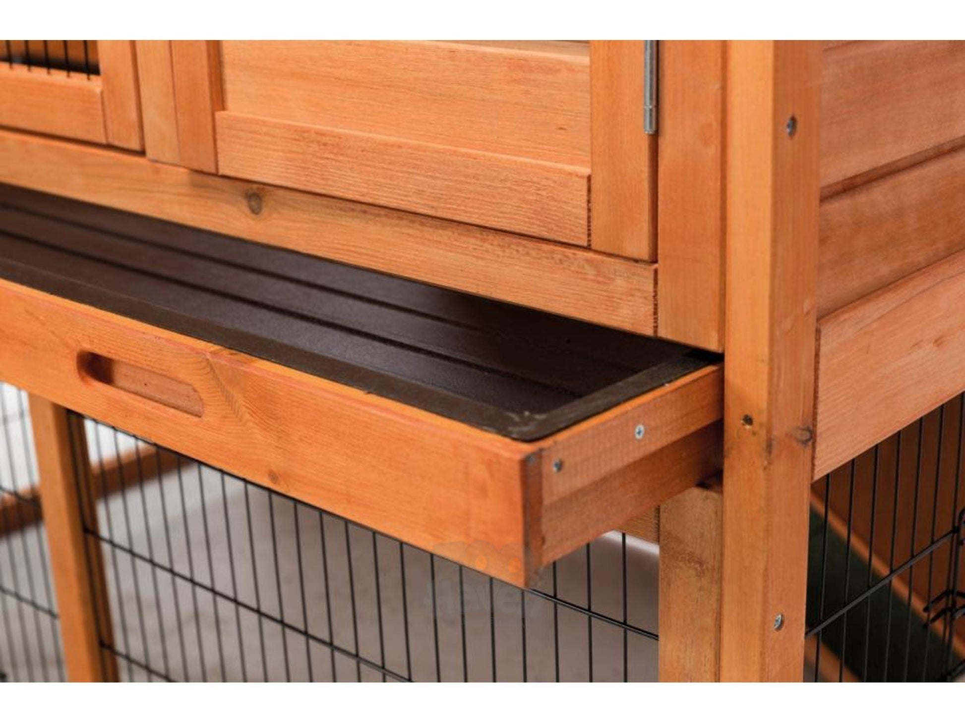 Den solide trekonstruksjonen kombinert med metallgitter gir et stabilt og luftig miljø, samtidig som løpegården gir ekstra plass til lek og mosjon uten at dyrene slipper ut. Flere dører gir enkel tilgang for fôring, vannpåfylling og rengjøring.
