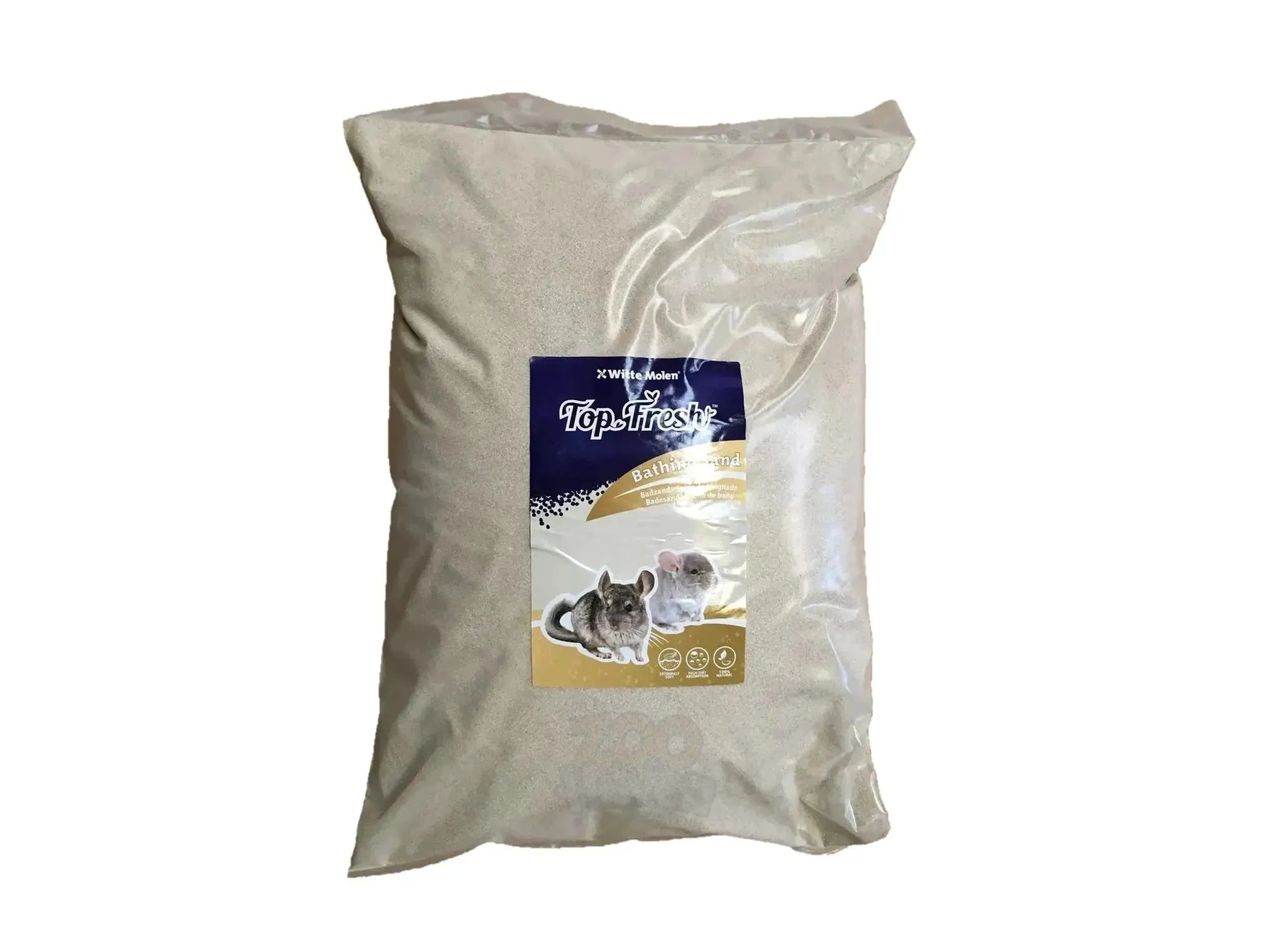 Witte Molen Chinchilla Badesand er en fin, naturlig og støvfri sand spesielt utviklet for pelspleie hos chinchilla, degus, ørkenrotter og andre små gnagere. Den finkornede strukturen trenger effektivt inn i pelsen og fjerner overflødig fett, smuss og fuktighet.